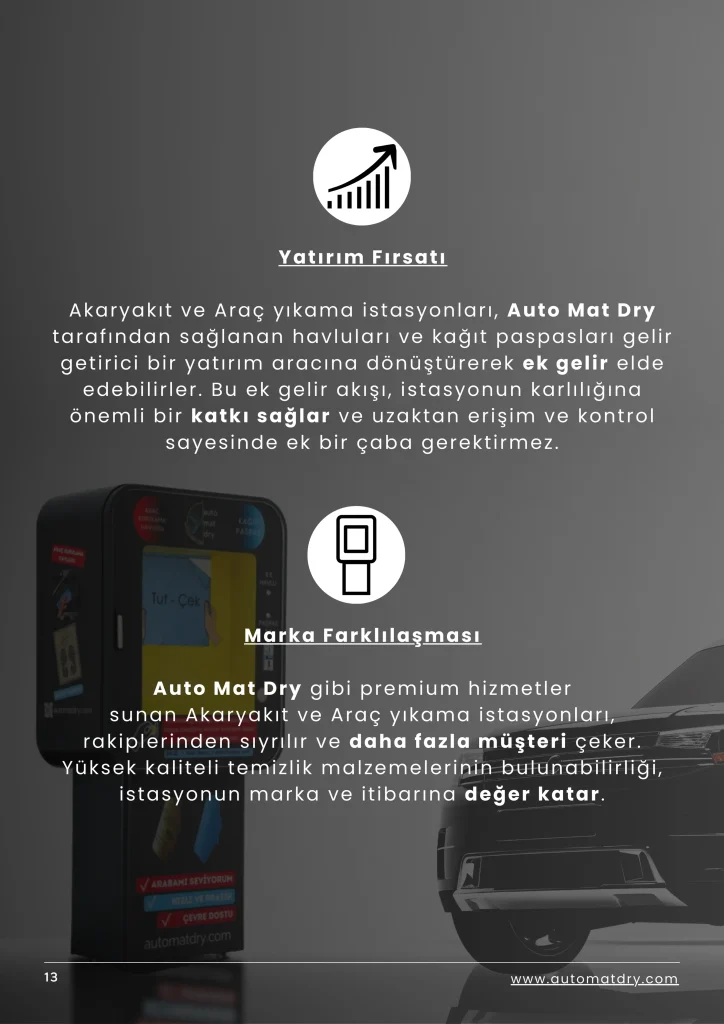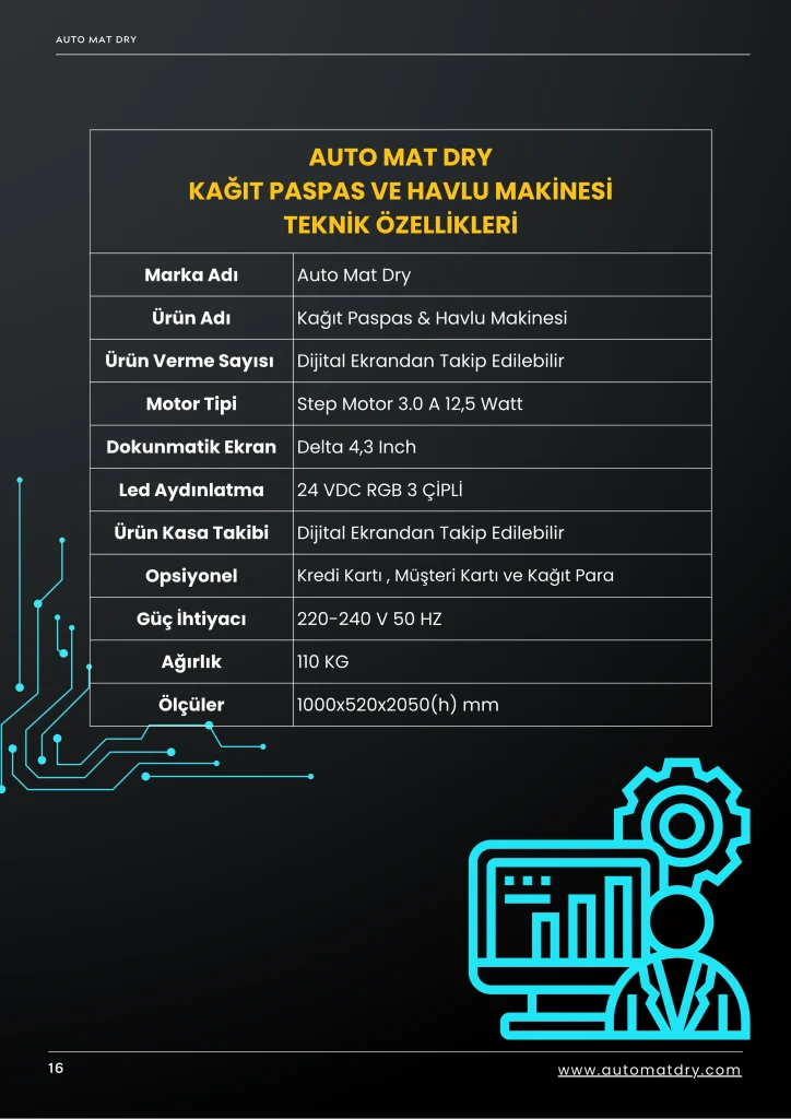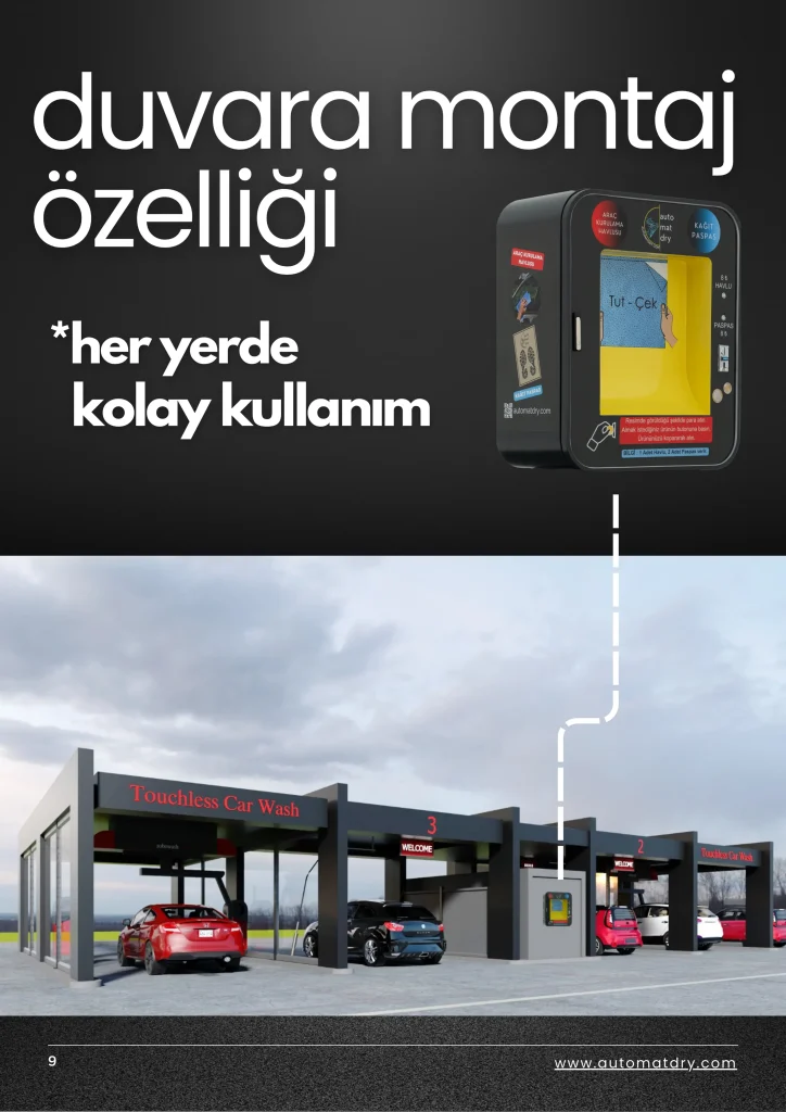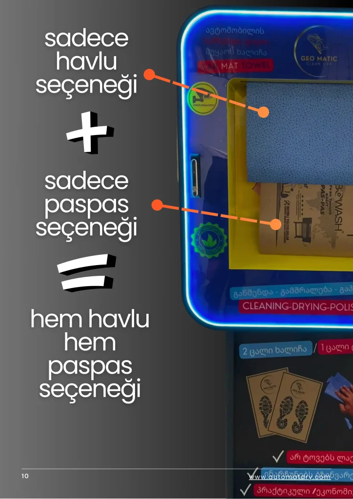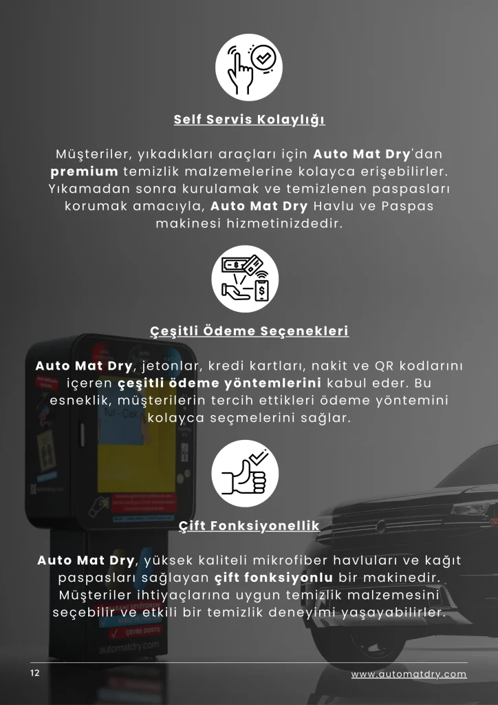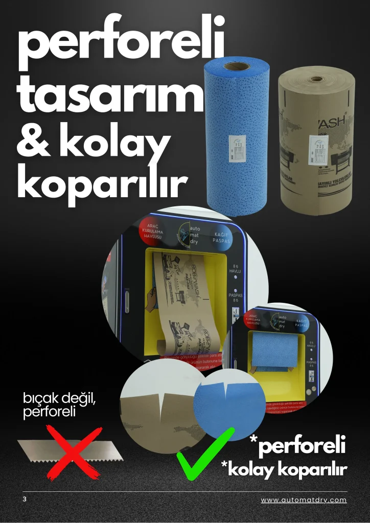 Self servis havlu ve kağıt paspas automatı, araçların içini ve dışını temizlemek için uygun havlu ve yıkama sonrası kullanabileceğiniz kağıt paspas tedariğini sağlamak amacıyla özel olarak tasarlanmıştır.